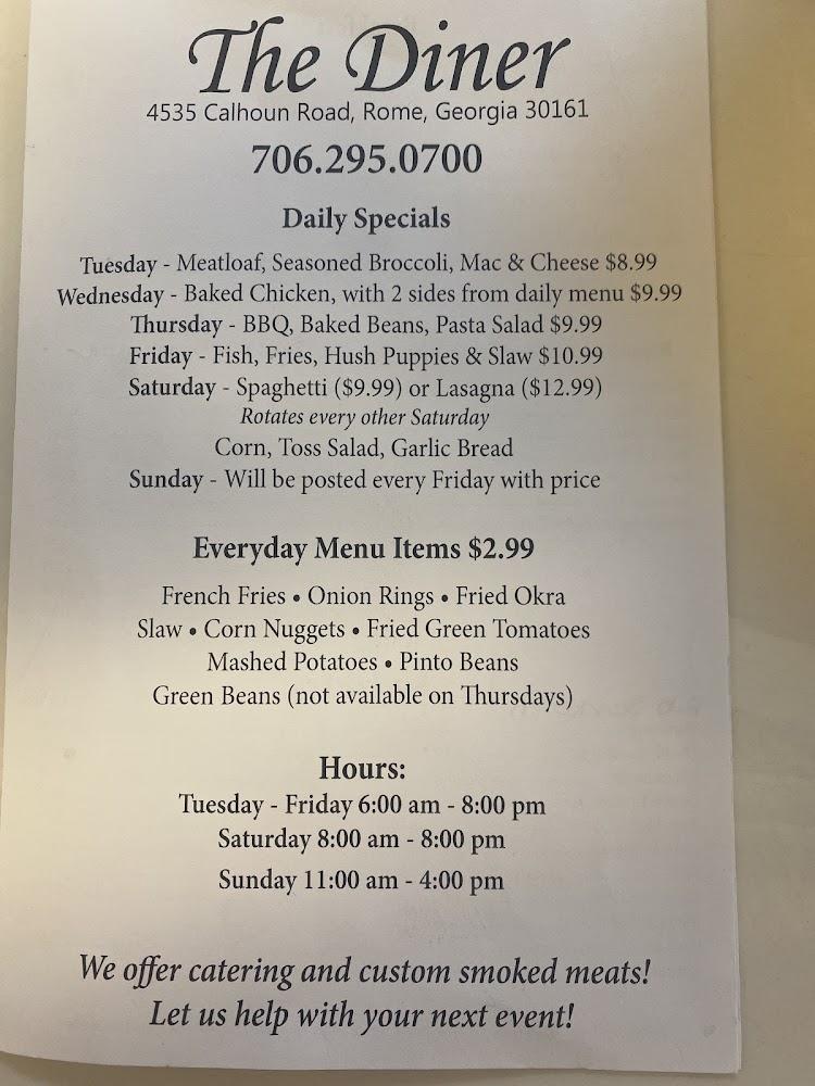 The menu at The Diner features a delightful mix of traditional southern dishes. Diners can enjoy meals from categories such as BBQ, salads, and appetizers. Signature dishes include pulled pork, fried catfish, and country-fried steak, catering to all tastes. A well-loved kids menu makes it friendly for families, featuring mini burgers and grilled cheese sandwiches.